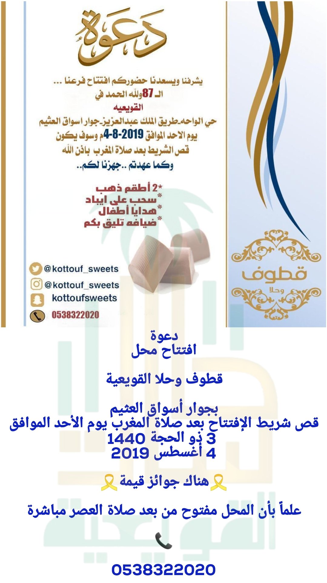 ساحات القويعية Twitterissa دعوة افتتاح محل قطوف وحلا القويعية بجوار أسواق العثيم قص شريط الإفتتاح بعد صلاة المغرب يوم الأحد الموافق 3 ذو الحجة 1440 4 أغسطس 2019 هناك جوائز قيمة علما